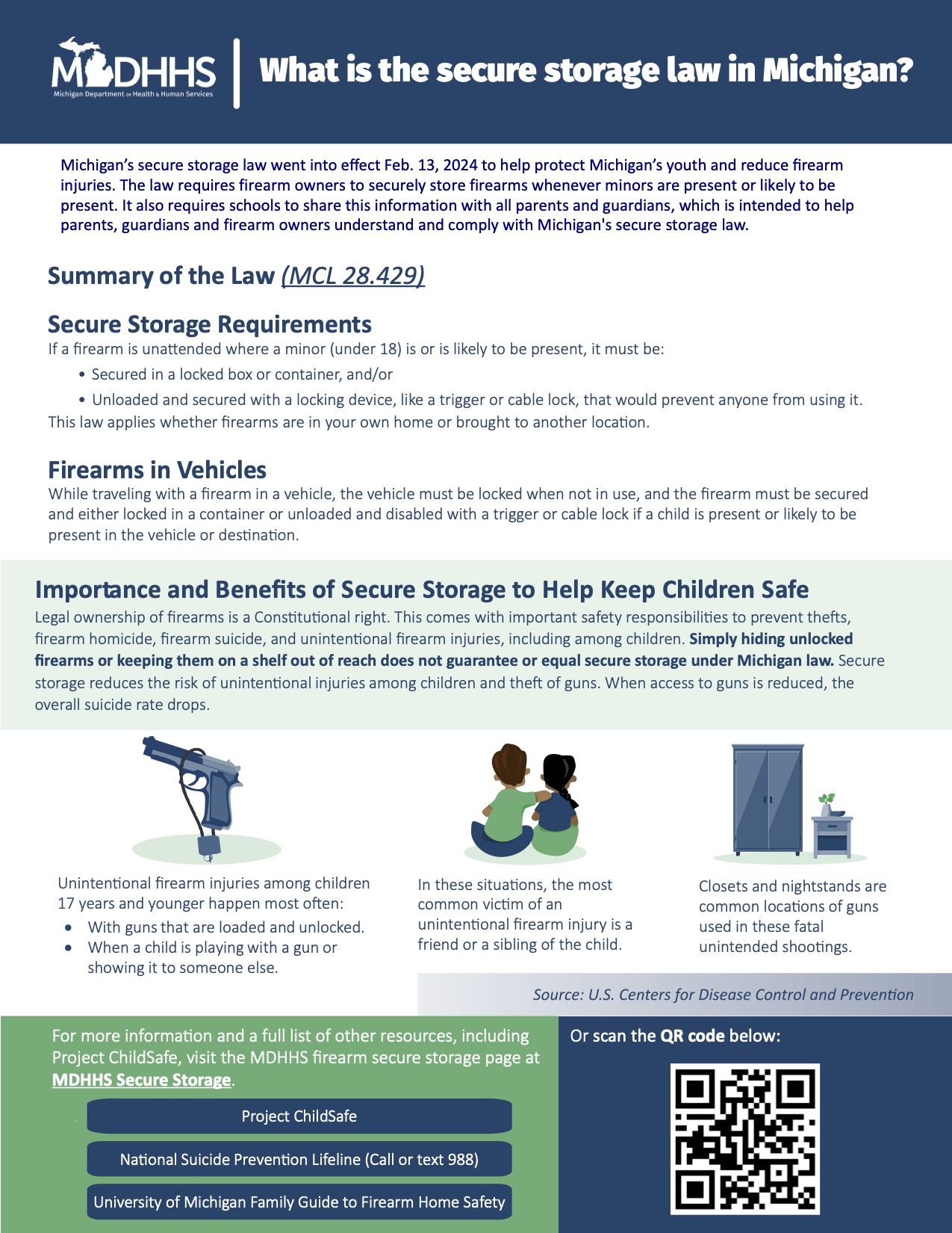 To help protect Michigan’s youth and prevent firearm-related unintentional injuries, Michigan Compiled Laws (MCL) 28.429, Section 9 of 1927 PA 372 requires firearm owners to securely store firearms wherever minors are present or likely to be present. In accordance with the “Safe Storage Laws,” MCL 28.429, MCL 380.1313a, and MCL 380.1313b, school districts are required to provide parents and caregivers with information on the safe storage of firearms. The Michigan Department of Health and Human Services provided this information to the Michigan Department of Education (MDE) for distribution. Specific resources required to be sent home to parents and caregivers include: