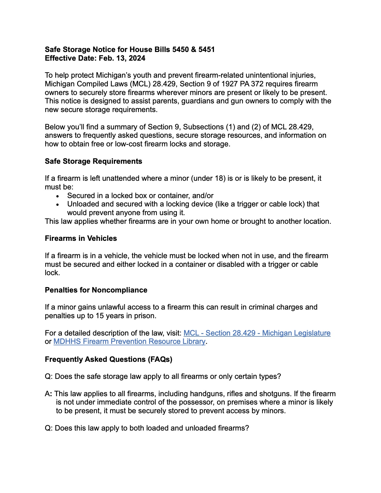 Additional resources and information can be found on MDE’s Safe Storage Law webpage. Questions may be directed to MDE’s Office of Health and Safety at MDE-OHS@Michigan.gov.