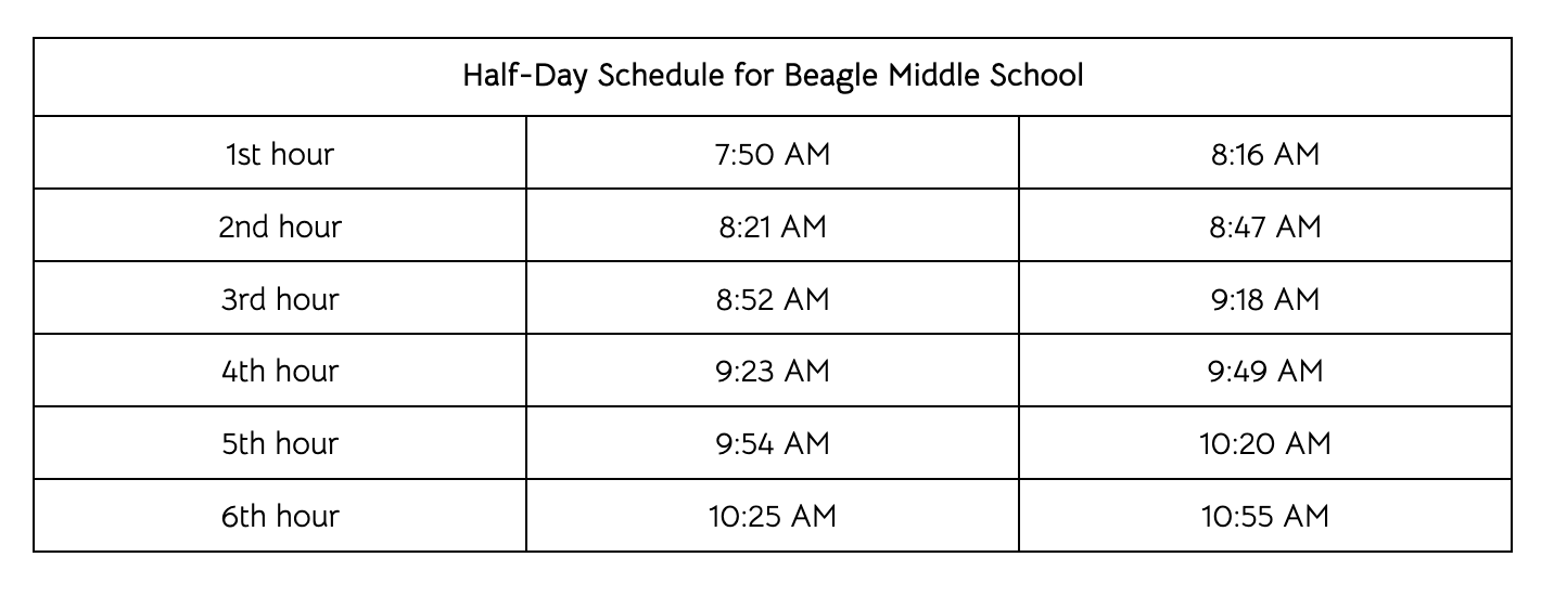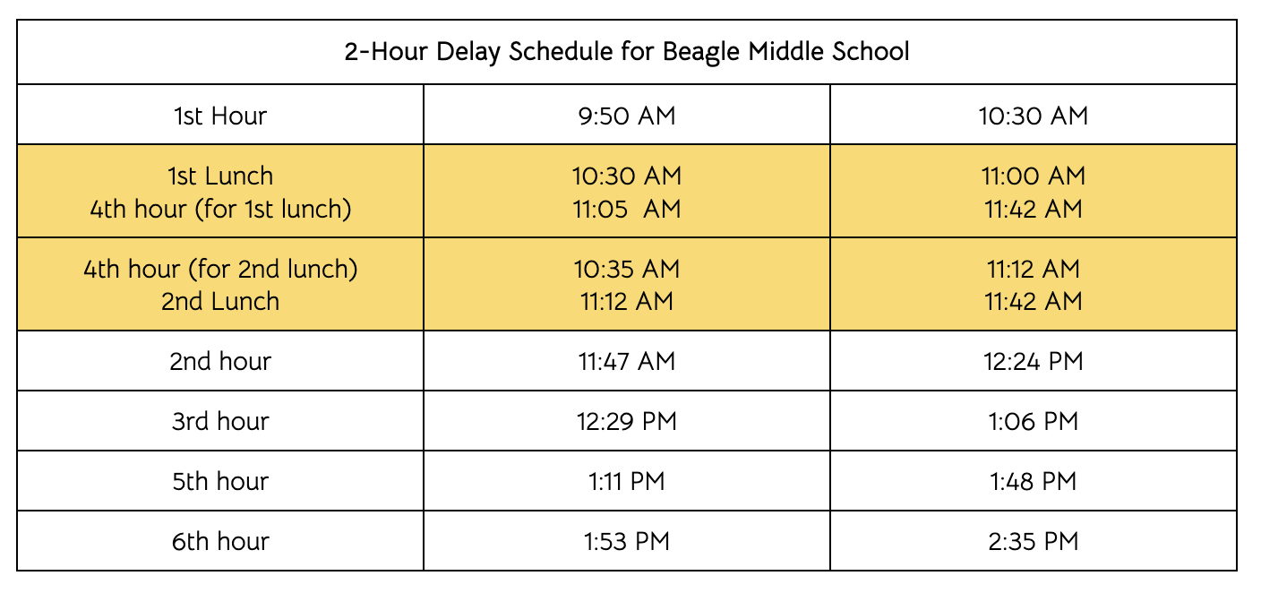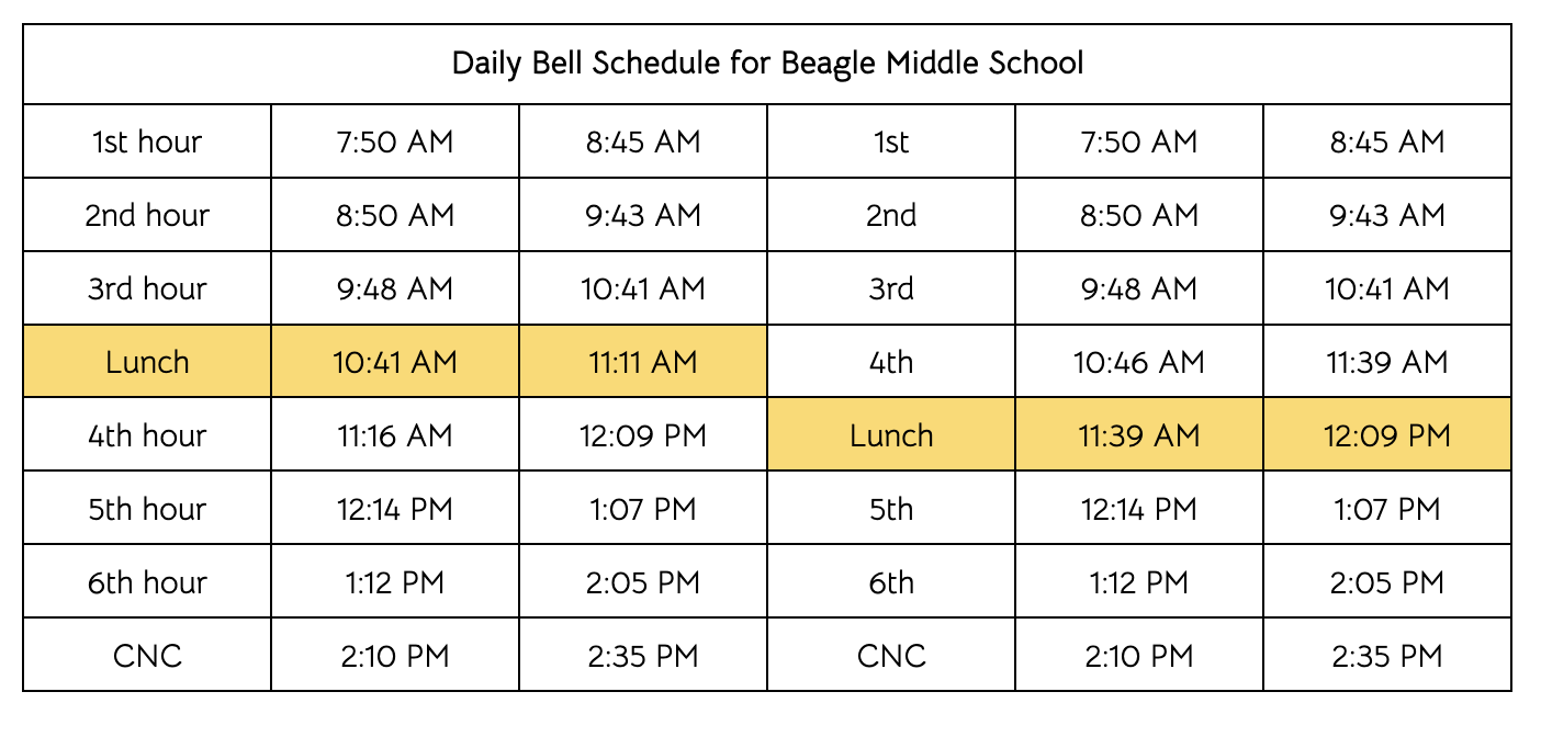 Passing Time: There is five-minute passing time between all classes. Students are expected to be in their class when the bell rings to be considered on-time to class. While we do have and enforce a tardy policy here at Beagle Middle, we also understand that the first few days of school is going to be a learning curve for many students, and we will be flexible and supportive in helping students find their classes.