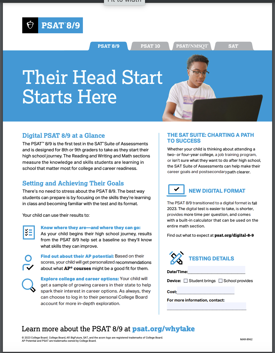 All 8th-grade students will participate in the PSAT 8 during the Spring. They will be assessed in the areas of ELA and Math.