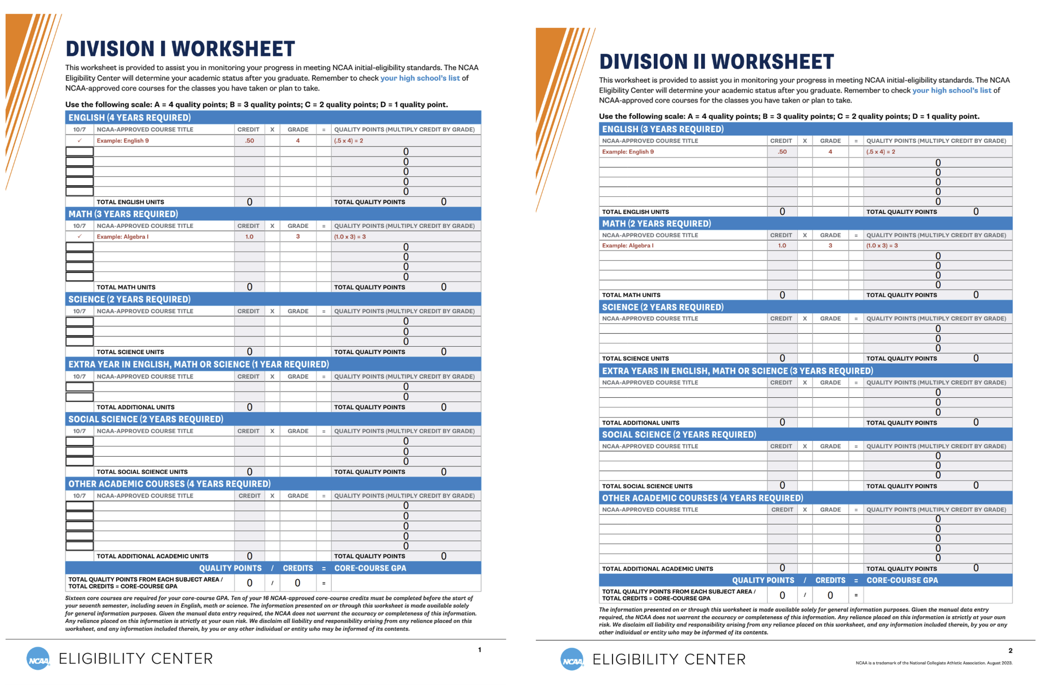 NCAA Core-Course GPA Division I and Division II Worksheets