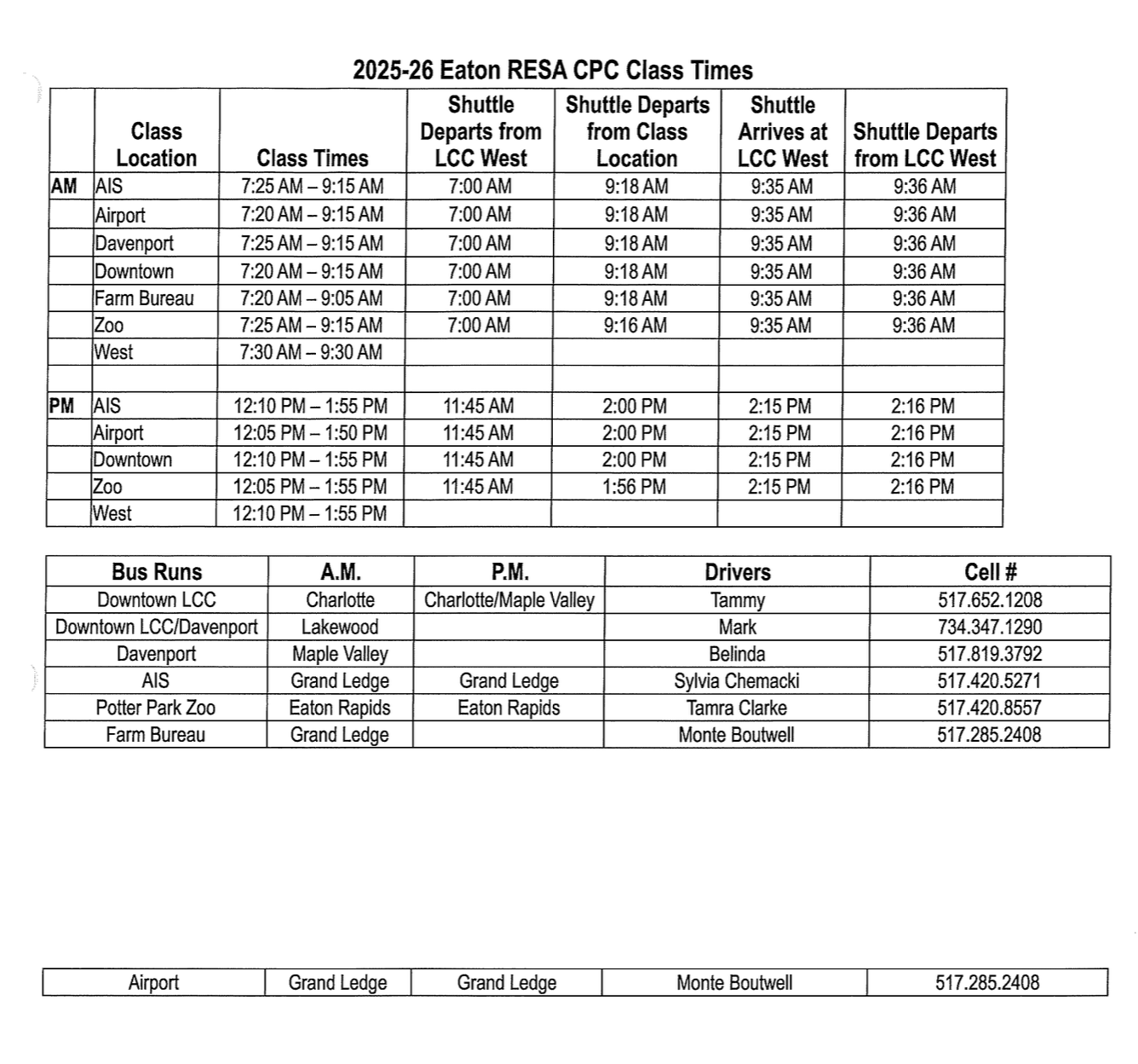 AM CPC Students: Buses leave Grand Ledge High School at 6:40 am and return at 10:05 am. Students will