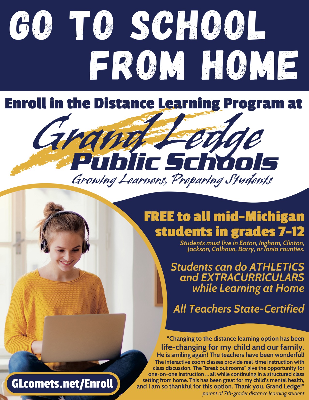 Information about the program can be found online at GLcomets.net/DistanceLearning. Please reach out to me – the Principal for the Distance Learning Program, Tricia Brentar (brentart@glcomets.net) – or Assistant Superintendent of Academic Services Steve Gabriel (gabriels@glcomets.net) with questions or concerns.