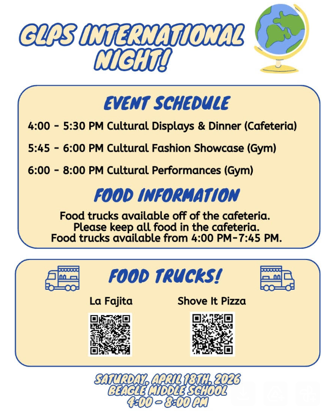 International Night is tomorrow, Saturday, April 18th, from 4-8 pm at Beagle Middle School. Come travel the world through interactive cultural displays, delicious food, a fashion show, and live performances.