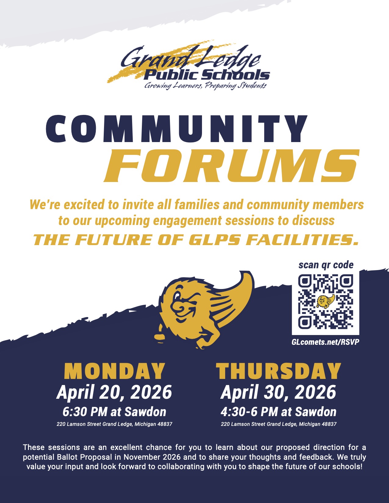 We have been able to provide significant upgrades through our current bond program, from a new Wacousta to the district restructuring to increased safety throughout the district, and we appreciate the support that our community has provided us through this process. We are now winding down the 2018 bond program, and as good stewards of the community’s resources, we need to look ahead at continued needs over the next five years. To those ends, we are currently partnering with architects TMP and construction managers Clark Construction to develop that plan, which could include a potential zero mill increase over our current rates bond proposal to enhance our instructional facilities. We spent the winter working with our partners and helping them get familiar with our needs, including those listed here from an October 2025 presentation. Now, we have reached a point where we would like to share our thoughts with you, our families, staff, and the community. To those ends, we are hosting two community forms, and would like to invite you to attend. Please see the flyer above for more details, and if you plan to attend, please RSVP at GLcomets.net/RSVP so we can maximize participant engagement.