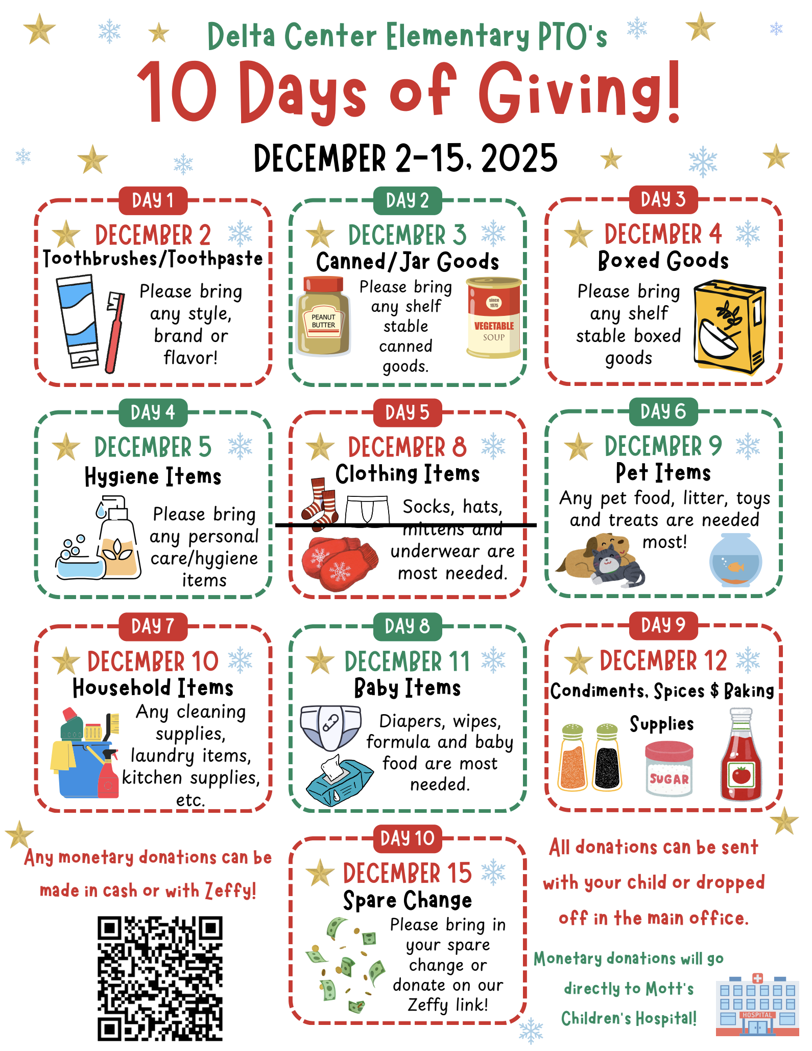 Our final day will be “Bring in Spare Change”, which can also be donated through our Zeffy link on any day during our Ten Days of Giving. After voting, our students selected Mott Children’s Hospital as the recipient of this year’s donations.